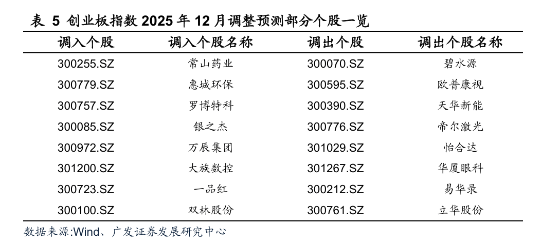创业板指数(399006.SZ)由在深圳证券交易所创业板上市交易且满足下列条件的所有A股:非 ST、*ST 股票;上市时间超过 6 个月,A 股总市值排名位于深圳市场前1%的股票除外;公司最近一年无重大违规、财务报告无重大问题;公司最近一年经营无异常、无重大亏损;考察期内股价无异常波动的个股组成样本空间,在对样本空间中的个股首先,计算入围选样空间股票在最近半年的 A 股日均总市值和 A 股日均成交金额;其次,对入围股票在最近半年的 A 股日均成交金额按从高到低排序,剔除排名后 10%的股票;然后,对选样空间剩余股票按照最近半年的 A 股日均总市值从高到低排序,选取前 100 名股票构成指数样本股。在排名相似的情况下,优先选取行业代表性强、盈利记录良好的上市公司股票作为样本股。每次样本股调整数量不超过样本总数的 10%。排名在样本数 70%范围之内的非原样本股按顺序入选,排名在样本数 130%范围之内的原样本股按顺序优先保留。