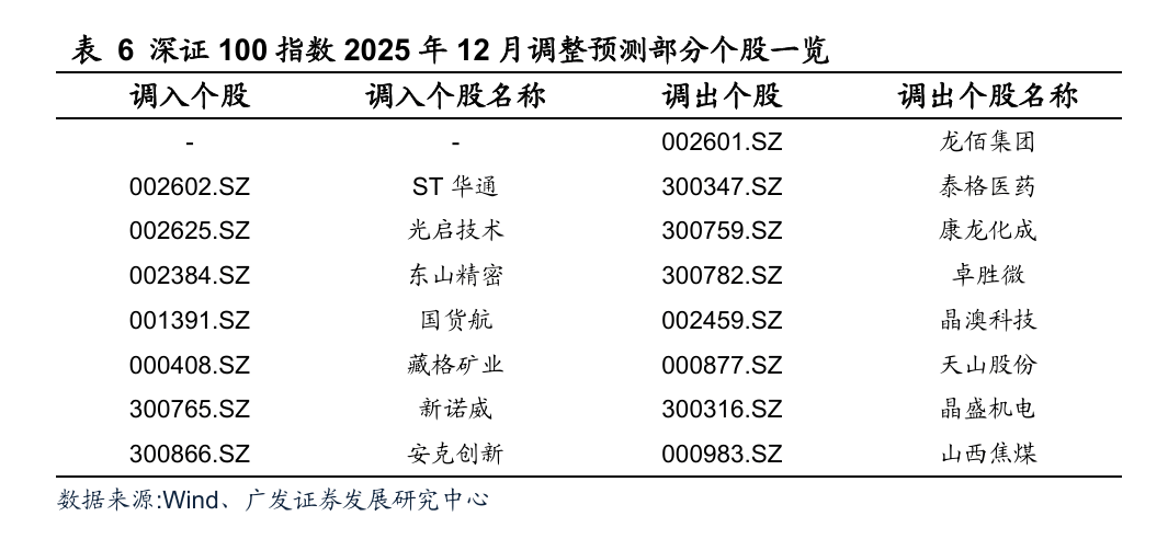 (六)深证100指数成分股调整预测深证100指数(399330.SZ)由满足以下所有条件的个股组成样本空间:在深圳证券交易所上市交易且满足下列条件的所有 A 股:非 ST、*ST 股票;上市时间超过六个月,A 股总市值排名位于深圳市场前1%的股票除外;公司最近一年无重大违规、财务报告无重大问题;公司最近一年经营无异常、无重大亏损;考察期内股价无异常波动。对样本空间中个股首先,计算入围选样空间股票在最近半年的 A 股日均总市值和 A 股日均成交金额;其次,对入围股票在最近半年的 A 股日均成交金额按从高到低排序,剔除排名后 10%的股票;然后,对选样空间剩余股票按照最近半年的 A 股日均总市值从高到低排序,选取前 100 名股票构成指数样本股。在排名相似的情况下,优先选取行业代表性强、盈利记录良好的上市公司股票作为样本股。每次样本股调整数量不超过样本总数的 10%。排名在样本数 70%范围之内的非原样本股按顺序入选,排名在样本数 130%范围之内的原样本股按顺序优先保留。
