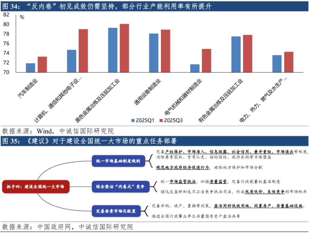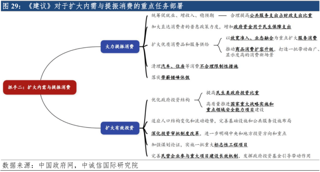 “民生”是“十五五”建议稿的高频词之一。经济增速放缓会暴露出经济快速增长掩盖的民生问题和社会问题。一方面,我国收入分配对消费修复的支撑有限,收入差距依旧较大;另一方面, 以人为本的新型城镇化仍有待进一步提升。《建议》通稿中对于民生领域的提法涉及促进高质量就业、完善收入分配制度、基本公共服务均等化、健全社保体系、人口、教育等问题,并且首次将房地产部署放在民生领域中,更加强调地产在“新发展模式”下的“民生”属性。预计收入分配改革、户籍制度、生育养老服务供给、公共资源和服务配置等关键领域改革将成为“十五五”时期的重点任务。抓手四:持续推进反内卷、建设全国统一大市场。