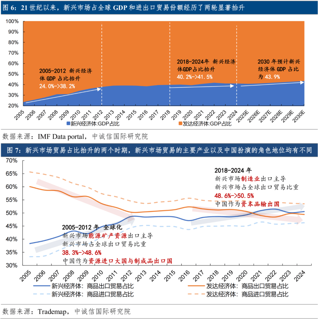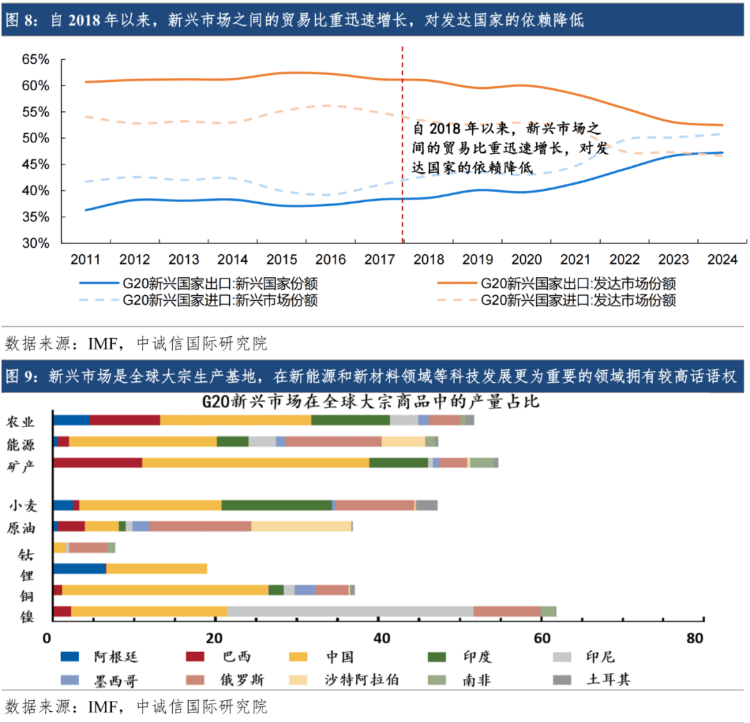 根据IMF统计口径,截至2024年,新兴市场GDP规模占全球的比重已经由2005年24%抬升至42%的水平,进出口贸易战全球的比重由2005年35.8%抬升至48.4%。尤其是近年来,越南、墨西哥、巴西等新兴国家逐渐承接更多的制造业转移,新兴市场的内部贸易(即“南南贸易”)和向发达经济体的贸易流量也出现了明显的分化,G20新兴国家向发达国家的进口/出口份额由53.2%/61%下降到2024年的46.6%/52.5%,对发达国家的依赖度显著降低。这意味着过去7年来,中国作为最大新兴市场,通过“一带一路”倡议、对东南亚/拉美的投资,直接拉动了新兴市场内部的贸易增长,全球贸易逐渐形成了以“美国-中国”为枢纽的多极化贸易体系。得益于新能源、新材料领域的矿产资源禀赋及新兴市场工业化进程加快,“十五五”时期中国在全球的经贸领域的重要性和话语权将进一步提升。一方面,