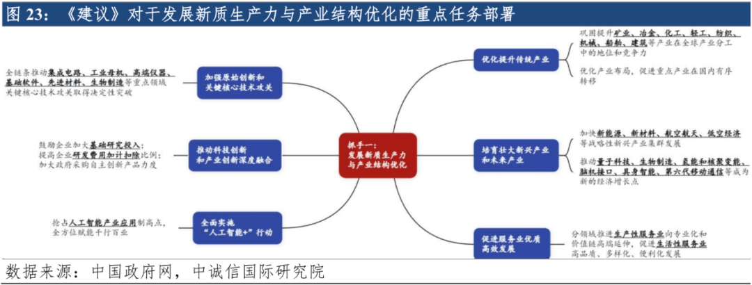 一是优先考虑向居民发放现金或数字货币,特别是针对边际消费倾向比较高的中低收入人群,除生育补贴外,加强对特殊群体的救助帮扶和民生补贴支持;二是进一步解决保障房问题,结合需求去房地产库存。据估算解决3亿“新市民”的保障性住房需求,“十五五”大约每年需要收储资金2.8-4.5万亿元;三是推进公共服务均等化,通过为“新市民”安家配套医疗、教育、养老、托幼等基础设施,释放消费潜力;四是进一步扩大拖欠款的清偿主体和清偿金额范围,通过建立分类处置、资产盘活等机制,实质性化解存量债务。坚持以发展新质生产力为核心,构建现代化产业体系。