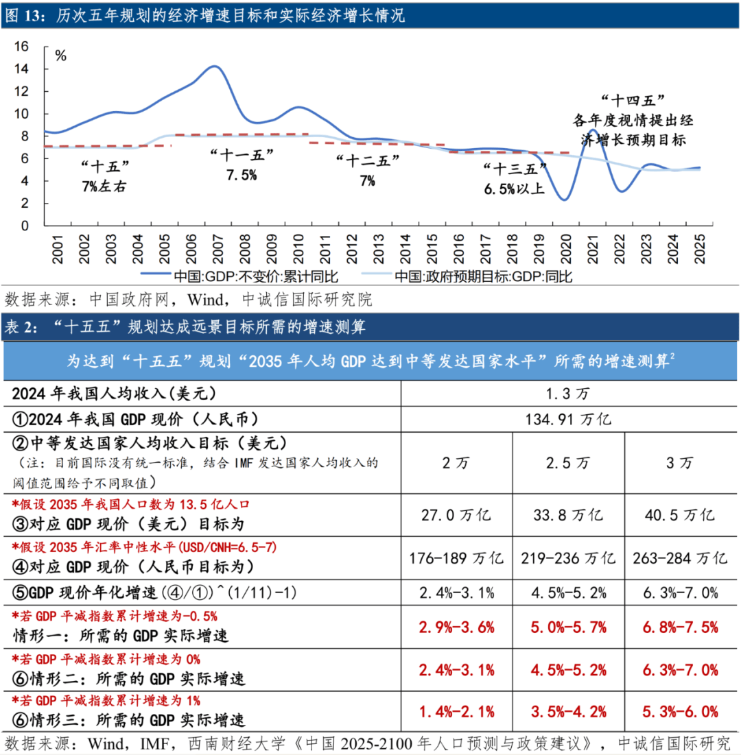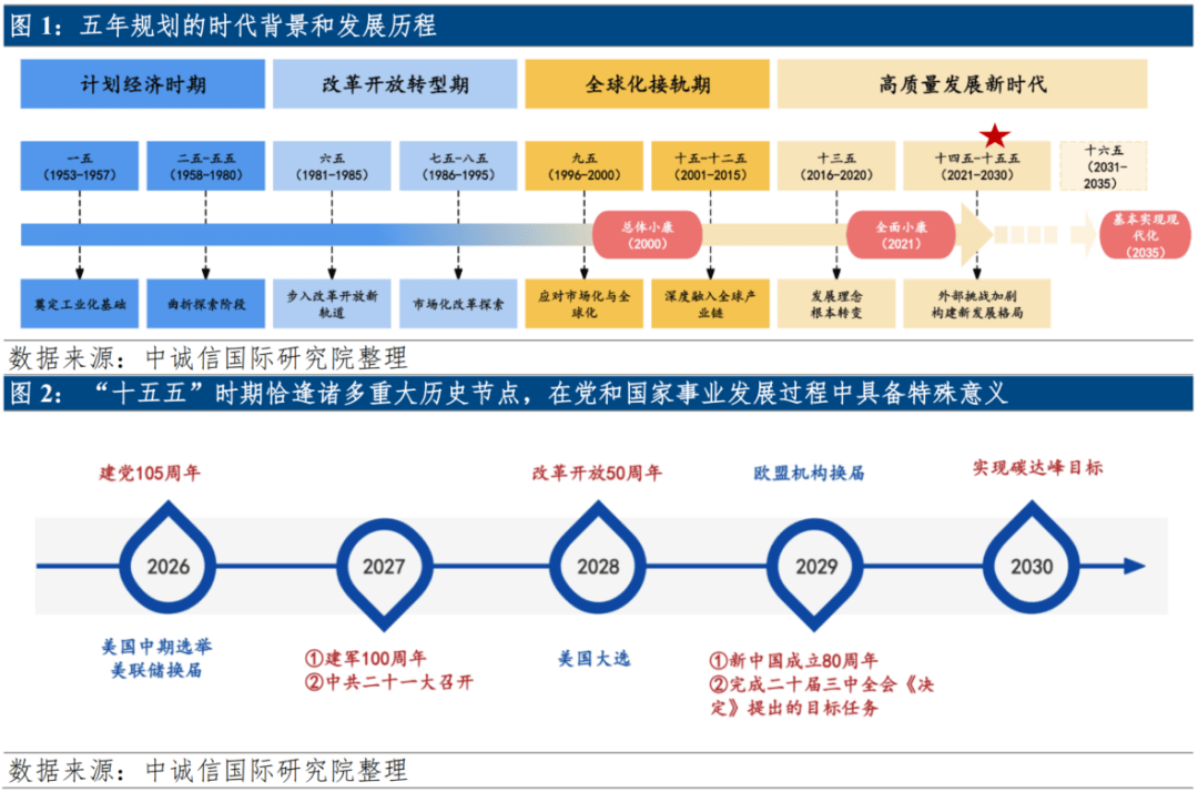 2021年我国实现全面小康的百年目标,十四五作为此后第一个五年规划,仍带有巩固小康成果、解决遗留问题的任务,同时遭遇了全球疫情、地缘冲突频繁、逆全球化加剧等重大外部挑战,具备“开局”与“过渡”属性。“十五五”时期承接“十四五”,要为实现2035年远景目标赢得战略主动,这对“十五五”时期经济高质量发展提出了更高的要求;二是任务上“攻坚落地”,“十五五”时期我国多项战略目标面临收官,一方面,“十五五”是实现2030年“碳达峰”目标的最后五年,也是任务最艰巨的五年;另一方面,二十届三中全会明确提出在2029年完成《决定》提出的各项改革任务,客观来看,当前改革仍处于顶层设计和重点领域试点突破的阶段,部分关键领域改革的“第一脚”已经踢出,如《民营经济促进法》、《全国统一大市场建设指引(试行)》的出台,“十五五”将处于改革举措大规模推进的关键时期。三是重大历史节点汇聚,“十五五”时期恰逢诸多重大历史节点,包括2026年建党105周年、2027年建军100周年、2028年改革开放50周年、2029年新中国成立80周年等,在党和国家事业发展过程中具备特殊意义。