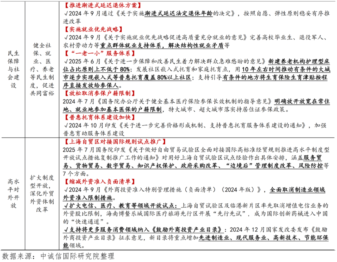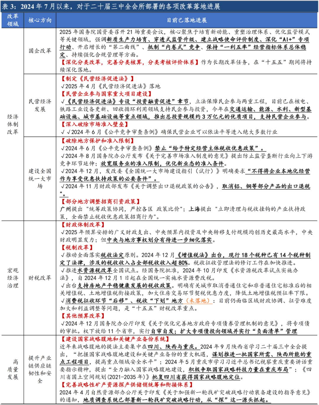 2024年7月二十届三中全会召开以来,针对经济体制、财税、民生保障与社会建设体制等领域的改革部署已陆续落地,但仍有部分改革领域落地进展不及预期,如消费税环节后移、税收下划地方的相关改革面临区域财政协调、征管难度加大和利益调整等问题,如零基预算改革、地方税完善等财税体制改革举措有待进一步细化落实。“十五五”时期所面临的改革领域大多是积淀已久的“难啃的硬骨头”,一方面,诸如收入分配制度改革、建设全国统一大市场等任务,往往需要破除长期形成的地方保护主义、部门壁垒和既得利益格局,尽管市场准入负面清单已持续缩减、全国统一电力市场体系等要素市场化配置机制初步建成,但隐性壁垒的清除仍面临深层阻力;