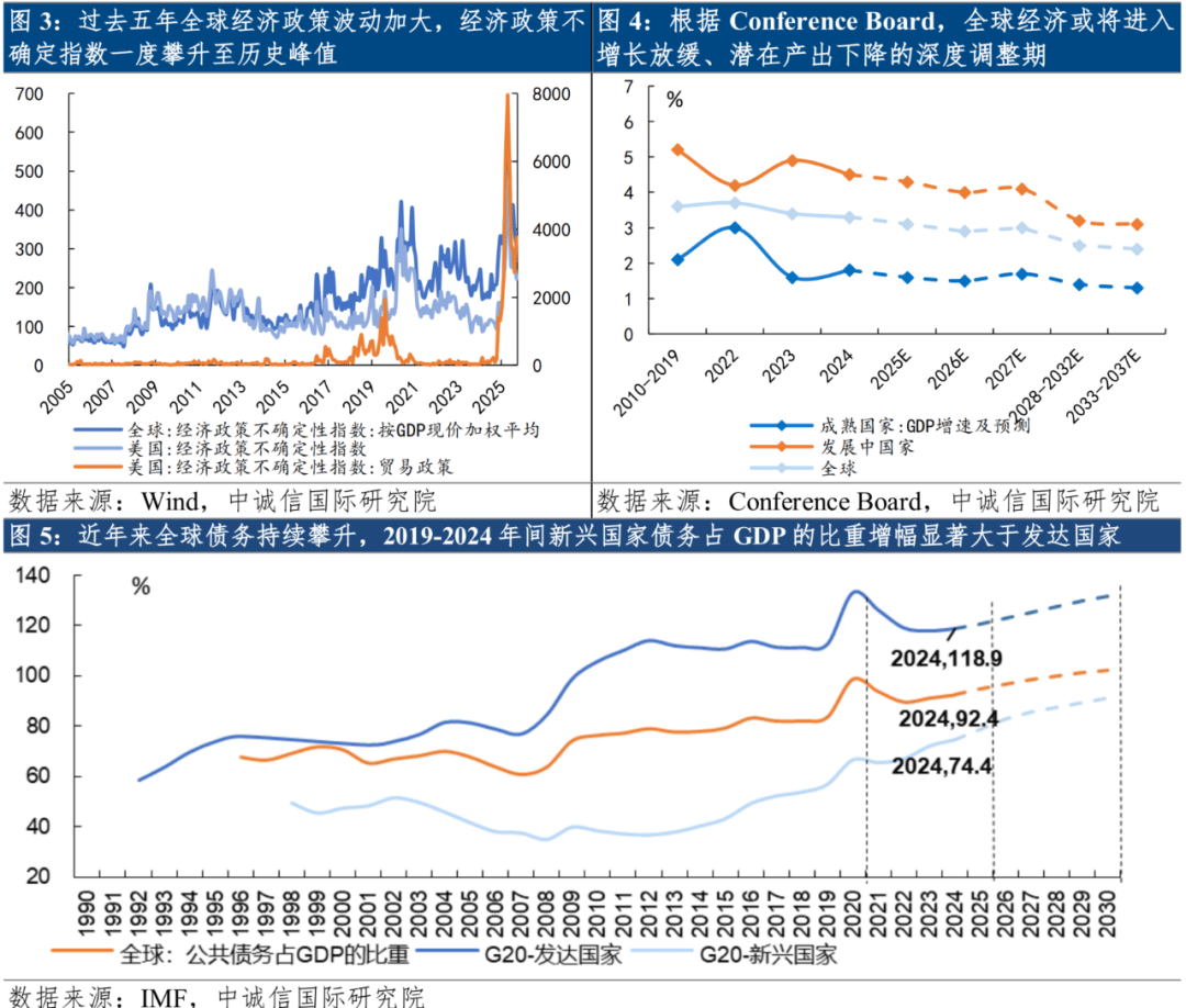 根据BIS数据,2024年全球非金融部门债务规模达236.4万亿美元,杠杆率达235.7%,债务规模不断攀升,特别是公共部门债务,截至2024年底,全球公共债务规模占全球GDP的92%左右,已达到近30年来的峰值水平(除2020年),同时,近年来全球其是新兴市场债务持续攀升,2019年至2024年新兴国家债务占GDP的比重由56.8%抬升至74.4%,增幅(17.6%)显著大于发达国家(6.1%)。未来五年各经济体对于刺激经济、扶持产业竞争、维护供应链安全等方面的财政支出或仍保持较高水平,来自债务和通胀的压力仍然较大。