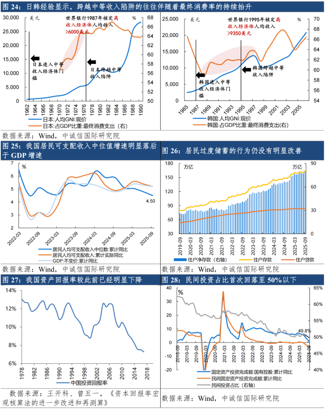 2024年我国人均国民收入(GNI)为1.37万美元,根据世界银行的基于2024年各国GNI数据的最新标准,我国已处于中等收入偏上型经济体,离高收入经济体1.48万美元的门槛越来越近,“十五五”或处于我国能否跨越中等收入陷阱的关键时期。从国际经验看,日本和韩国分别于1977年和1995年迈入高收入经济体的行业,值得一提的是,日韩成功跨越中等收入陷阱的时期往往伴随着最终消费率的持续抬升,虽然不具备因果关系,但可以说明可持续的内需驱动,特别是消费驱动是经济体成功跨越中等收入陷阱的必要条件,进一步扩大内需、提振消费将成为“十五五”时期构建经济良性循环的主要抓手。有效需求不足仍是“十五五”时期制约内循环的核心堵点,当前消费和投资均面临一定的限制因素。消费是居民持久收入的函数,当前我国居民可支配收入面临增长较慢、分配不均衡的问题,制约消费修复。
