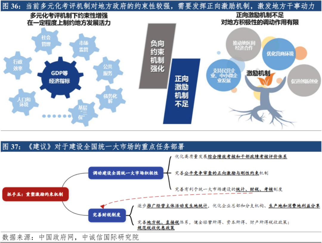 制。通过优化“指挥棒”考核,带动经济主体预期和行为模式的改变;另一方面着重加快推动财税体制改革、完善财税制度,结合“十五五”规划建议稿以及《辅导读本》中蓝佛安部长的发言,后续或主要围绕理顺央地关系、深化税制改革以增强地方自主财力、推进零基预算改革等重点财税改革领域展开。此外,考虑到当前海外科技制裁频发、企业经营信心较为疲软的背景下,释放企业经营活力的必要性上升,“十五五”时期或进一步优化市场主体的营商环境,通过有序放宽市场准入、简化行政审批流程、完善公平竞争审查机制、完善增值税留抵退税政策等措施实质性减轻企业负担,提升市场资源配置效率。