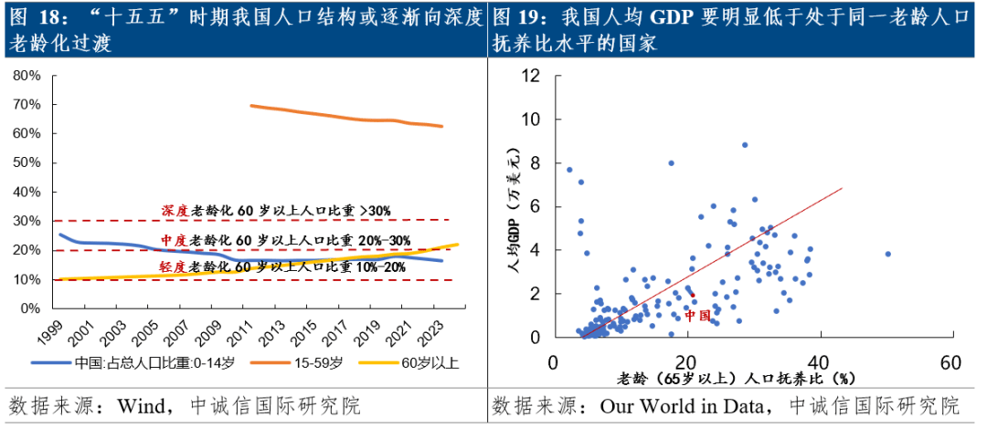 按照联合国发布的以60岁以上人口占比超过20%作为“中度老龄化”标准,我国于2023年进入中度老龄化社会,截至2024年,我国60岁及以上人口占全国人口的22.0%。“十五五”时期我国人口结构或逐渐向深度老龄化过渡,根据中国人口与发展研究中心预测,在2025-2030年期间,老龄化率或进一步增加至27.7%,接近深度老龄化(60岁以上人口占比30%以上)的水平。一方面,人口结构变迁会驱动消费需求结构的调整,如银发群体的需求推动了医疗健康、康养服务和陪伴型消费等领域增长,但当前消费供给的调整滞后于需求,对“十五五”时期消费的创新供给提出了更高的要求;另一方面,我国“未富先老”的压力更为突出,根据最新数据,2023年我国65岁以上老年人口抚养比为20.7%,意味着每名老年人需要约5 名劳动人口来进行抚养,而我国人均GDP要明显低于处于同等抚养比的国家,如韩国(25.9%)、爱尔兰(23.7%)、智利(19.8%)。倘若人口仍处于较低自然增长率继续下滑,可以预期未来我国社会面临的养老保障经济压力会持续扩大,对养老金体系、医疗资源、养老服务提出更严峻、更迫切的挑战。