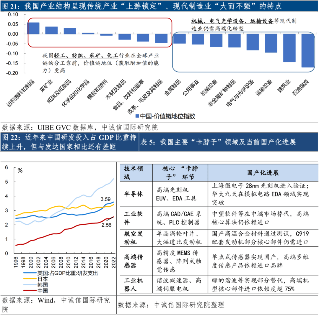 :一是以科技创新引领新质生产力发展为核心,聚焦产业提质升级,向全球价值链中高端跃升;二是以内需尤其是消费驱动,助力我国跨越中等国家陷阱,扭转微观主体预期偏弱的局面;三是以深化民生领域改革为根本,聚焦收入分配与户籍制度,推动现代化建设成果更公平地惠及全体人民;四是以建设全国统一大市场为牵引,破除地方保护与市场分割,为高质量发展扫清制度性障碍;五是重塑激励约束机制与优化发展环境,进一步释放地方干事动力与民企经营活力。(一)抓手一:科技创新与产业提质升级——塑造新动能