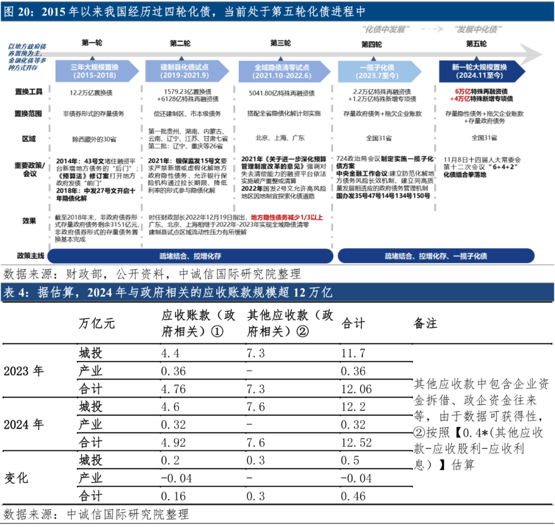 债务结构性问题较为突出,我国央地债务结构里中央债务占比较低,地方自身债务结构中一般债占比较低,而隐性债务或者政府性债务规模相对加大,区域债务风险的异质性在不断加剧;同时,“债务-资产”转化仍有提升空间,近年来诸如政府投资投向重复、专项债资金“钱等项目”、“趴在账上”、“资金闲置”、“资金挪用”等现象持续存在,地方政府专项债资金效率仍待进一步提升,城投企业资产收益率走低,对债务覆盖能力持续走弱,地方国有企业持续加杠杆但盈利能力持续低于规模以上工业企业的平均水平等。此外,债务“冰山”问题仍需持续关注,拖欠款、城投经营性债务等制约地方经济循环的问题仍需重视,需要在甄别的基础上分类解决[4]。据估算,2024年与政府机构相关的应收账款规模超12万亿,融资平台经营性金融债务规模约14.8万亿元,较2023年初下降25%左右,但仍然处于较高水平[5]。“债务可持续”是“财