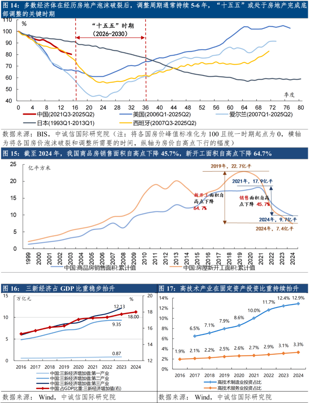 。而日本由于宏观政策应对失当和结构性问题的积压,经历了长达16年的地产调整周期。以70大中城市二手房的实际价格指数(剔除总物价水平变动)代表我国房地产的总体价格,截至2025年上半年,我国房地产价格已经调整近4年时间,较2021年三季度高点下降近20%(19.7%)。从地产销售链条看,2024年我国商品房销售面积自高点(2021年)下降45.7%,新开工面积自高点(2019年)下降64.7%,商品房销售情况已基本回到2008年前后的水平。在经历了深度出清、加速寻底的过程后,参照国际经验,“十五五”时期我国房地产或处于从底部向新周期过渡的阶段。预计房地产拖累最明显的“阵痛期”即将过去,对地方财政、金融系统和总需求的拖累效应边际减弱,房地产逐渐向民生主导的新模式转型,为经济结构顺利转型腾挪空间,向规模更合理、发展更可持续的新周期过渡。与此同时,经济要走出周期性底部,需要培育新动能作为新的经济增长点。