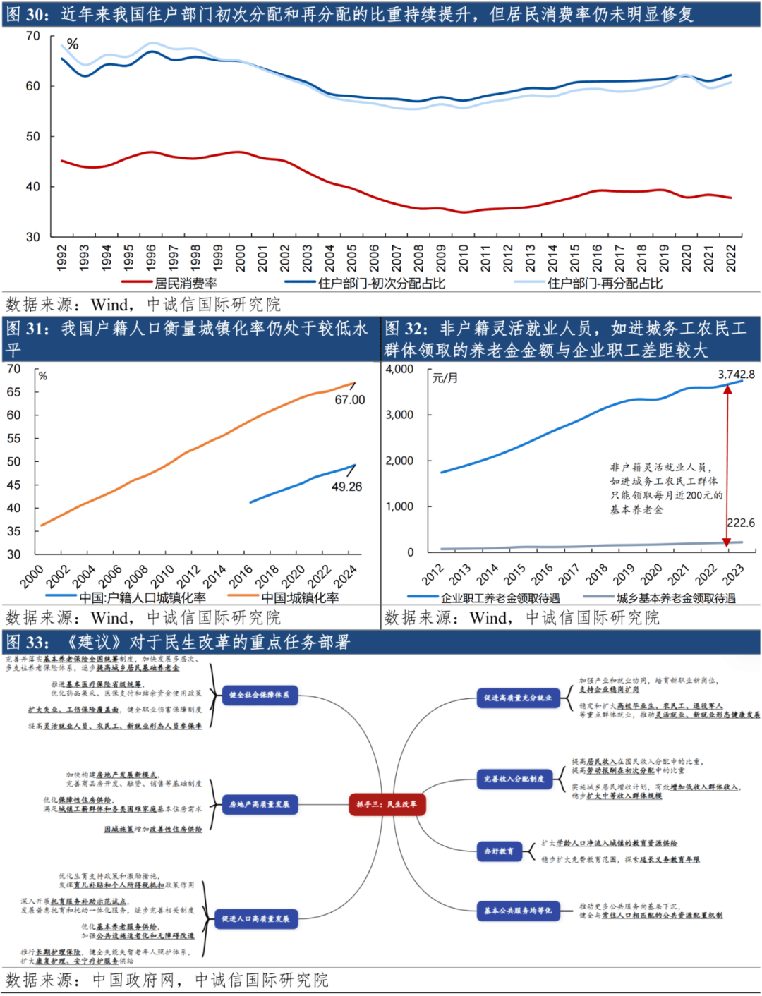 四中全会精神解读也提到“既要看GDP也要看GNI,既重视‘中国经济’也重视‘中国人经济’,表明民生改善的重要性日益凸显。经济增速放缓会暴露出经济快速增长掩盖的民生问题和社会问题。一方面,我国收入分配对消费修复的支撑有限,收入差距依旧较大,近年来我国居民部门初次/再分配收入占GDP的比重持续提升,但总体来看对居民消费的支撑效果有限,我国居民消费率仍没有修复至2019年的水平。从收入差距看,据国家统计局数据,2024年我国居民人均可支配收入基尼系数为0.465,仍处于0.4-0.5的“差距过大”区间。另一方面,以人为本的新型城镇化仍有待进一步提升,制约内需潜力的释放。2024年,我国常住人口城镇化率为67%,较发达国家80%的平均水平低约10个百分点,整体仍处于城镇化加快发展的过程中,而以户籍人口衡量城镇化率,2024年仅为48%,仍处于较低水平。据国家统计局的调查,目前仍有1.7亿进城农民工和随迁家属尚未在城镇落户,这些群体只能领取每月近200元的基本养老金,相较于企业职工养老待遇(3743元/月)差距较大,有序推进这部分人群市民化是城镇化的首要任务。“十五五”时期坚持人民至上,让现代化建设成果更多更公平惠及全体人民,就要深入落实民生改革,尤其是收入分配改革和户籍制度改革这些涉及人民收入和社会服务等关键领域改革。