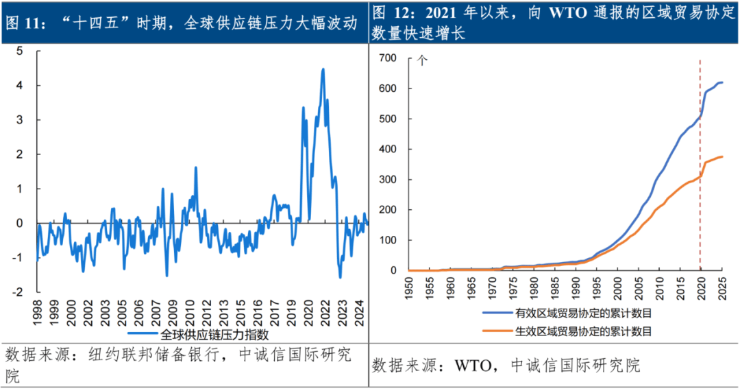 “十四五”时期,在新冠疫情、地缘冲突加剧、逆全球化兴起的背景下,全球供应链遭受较为严重的冲击。2020-2021年期间,纽约联储公布的全球供应链压力指数上升至历史峰值水平,作为应对,各经济体开始寻求降低对单一供应源的过度依赖,在此期间,向世界贸易组织(WTO)通报的区域贸易协定数量也快速增长,截至2025年8月,全球已生效的区域贸易协定共620个,中国参与的区域贸易协定共38个,全球供应链逐渐形成区域化、短链化、多元化发展态势。进入2025年,以特朗普第二任期为标志性节点,供应链重构正式进入“下半场”,今年以来全球主要经济体展开密集的外交活动,议题高度聚焦于关键矿产、清洁能源、生物技术和半导体等战略领域,其目标已不再是单一的分散贸易风险,而是选择有长期合作默契的伙伴进行共同研发、定向投资的深度绑定。“十五五”时期,大国竞争将进一步向政治化、逆全球化发展,不确定性显著增加,全球供应链或更易受到国家政治力量推动,以地缘政治和战略安全为导向的供应链布局,将成为“十五五”时期全球供应格局演变的主线。