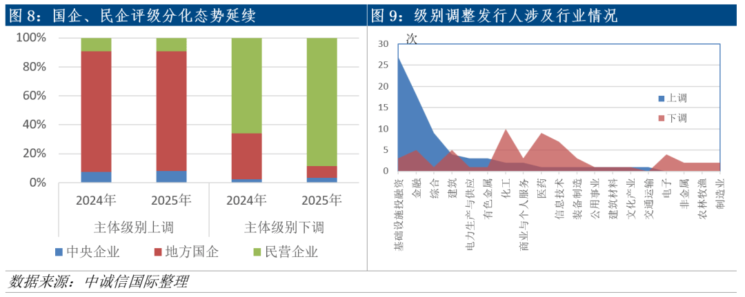 从企业性质来看,国有企业与民营企业评级调整分化现象持续。其中,级别下调行动依旧以民营企业为主,级别下调共涉及45家民营企业,下调54次,在全部评级下调行动中占近九成。而在级别上调行动中则以国有企业为主,在主体级别上调的73家主体中,中央/地方国有企业有66家,占比超过九成。从行业分布来看,不同行业主体级别调整依旧呈现分化特点,产业类发行人以级别下调为主,其中化工、医药、信息技术、装备制造、电子、建筑等传统及新兴领域行业主体下调较多;基础设施投融资行业发行人和金融机构依旧以级别上调为主。