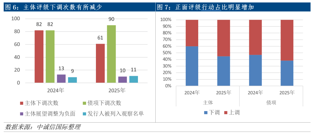 在债券市场信用风险释放趋缓的背景下,年内主体评级上调次数及占比均有所增加。全年债市共发生主体级别调整136次,与上一年基本持平。其中,级别下调61次,同比减少25.6%;级别上调75次,同比增加36%,在所有评级行动中占比超过55%,同比增加15个百分点。债项调整方面,受单家发行人存续债数量较多影响,债项调整次数增幅较为显著,共计234次,同比增加34%。其中,债项级别上调144次,同比增加54.8%,在总调整次数中占比也进一步增加至超过六成。