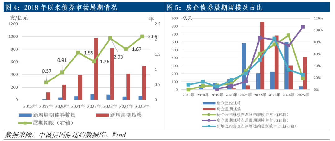 从结构上看,再次展期债券占比超过六成,是推高展期规模的主因。其中多数是2022年或2023年已展期2-4年、应于2025年到期的债券,反映出部分企业偿债压力尚未实质缓解。同时,发行人对于展期期限的诉求有所提高,平均展期期限为2.09年,较上年延长0.42年,体现了企业期望通过更长的缓冲期化解偿债压力。展期规模上升与期限拉长,虽为发行人提供了风险缓释空间,但也表明相关发行人长期以来面临的流动性压力尚未实质改善,后续仍需持续关注展期债券的实际兑付进展,防范个别风险通过重复展期积累。
