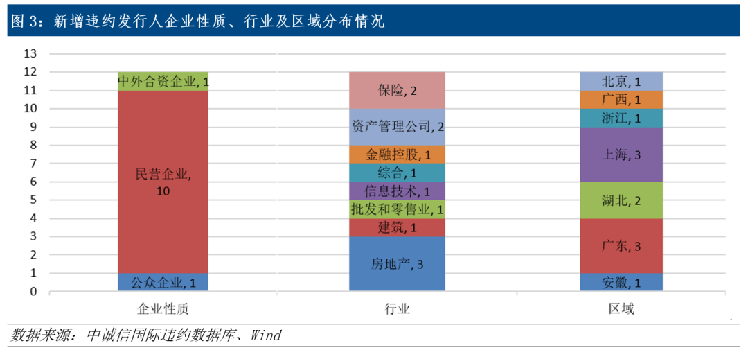 当前违约风险呈现多点散发、行业分散的特征,尚未形成明显的区域或领域性集聚。从行业分布看,违约主体覆盖8个行业类别,呈现多元分散特征。具体包括房地产企业3家以及建筑、批发零售、信息技术、综合类企业各1家。值得关注的是,非银金融机构违约增多,涉及资产管理公司2家、保险公司2家和金融控股公司1家,反映在严监管与市场波动环境下,部分非银机构流动性管理与资产质量面临考验。从地域分布看,违约主体覆盖东、中、西部地区共7个省份。广东、上海、浙江等经济发达省份亦有个别违约出现,体现了信用风险在多区域点状散发、无显著区域集聚的特点。