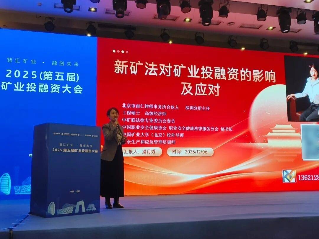 北京市雨仁律师事务所合伙人、深圳分所主任、中国矿业联合会法律专业委员会委员潘月秀,聚焦新矿法实施后的行业生态变革,为矿业投融资活动划清 “机遇线” 与 “安全线”。她从法律实务视角出发,拆解新矿法在矿权流转、资源配置、环保责任等方面的核心修订要点,分析政策红利释放下的投融资新场景 —— 如绿色矿山项目的融资倾斜、矿权交易的市场化机遇等。同时,潘月秀律师还将针对性提示合规审查、合同签订、纠纷解决等环节的潜在风险,为企业合规开展投融资业务提供专业、可落地的法律指导。