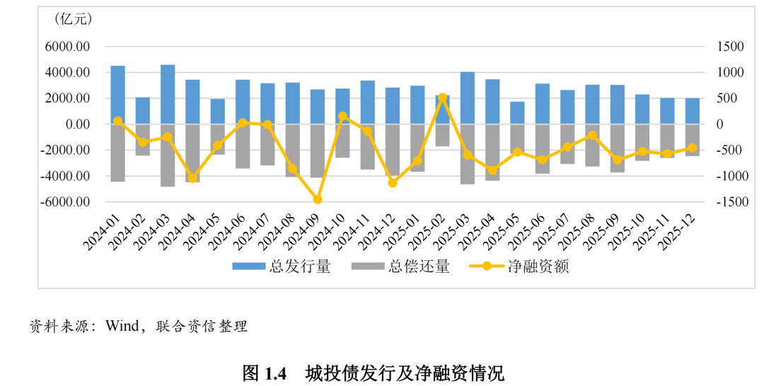 2025年,城投行业延续化债与发展并重的政策思路,在高压监管基调保持不变的同时,通过多工具协同支持与系统改革推动债务风险从被动处置向主动化解转变。具体来看,一是全力化解存量风险。2025年,财政支持力度持续加码,靠前使用化债额度、两个“5000亿”(新型政策性金融工具、债务结存限额)等多政策工具协同发力,为化解存量债务提供多维度支持;二是监管严格控制新增。中央及地方持续健全全链条债务风险管控机制,通过监测体系升级与审核标准收紧严防新增;2025年11月财政部成立债务管理司,整合债务管理链条,进一步推动债务的全过程监管。此外,财政部年内两次公开通报隐性债务问责案例,持续强化“终身问责、倒查责任”的纪律高压。三是推动融资平台退出和市场化转型。年初“99号文”明确重点省份退出标准,加速推动城投企业退平台进程,在平台数量与债务规模压降的基础上,着力引导其开展市场化经营,系统构建可持续发展的新模式。在此背景下,城投债供给持续收紧,净融资缺口进一步扩大。2025年,全国城投债发行规模3.65万亿元,同比下降4.04%,净融资流出规模达6167.24亿元,同比扩大14.24%,除2月外,其余月份均为净流出状态。