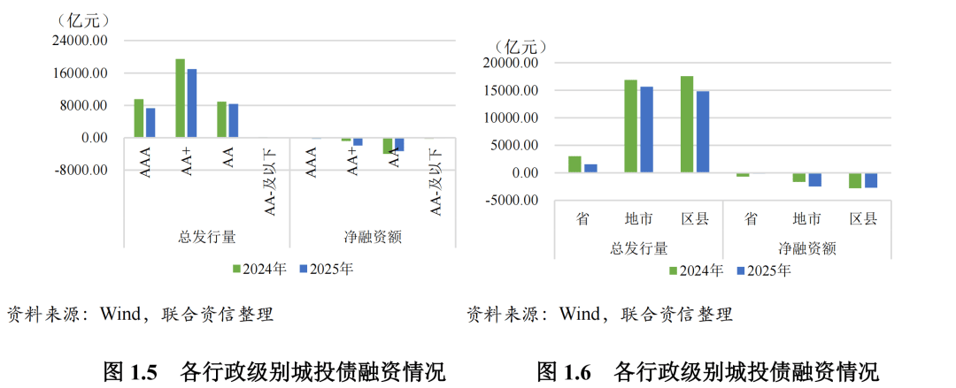 化债持续推进下各类主体的发行量及净融资额整体进一步压降。具体来看,信用等级方面,城投债发行主体仍以高等级主体为主,各级别平台均呈现净流出状态,中、低等级主体净偿还体量较大。行政层级方面,各层级城投债净融资均为负,其中区县级净流出规模较大。区域方面,全国各省市债券融资整体呈进一步压降态势,区域之间的城投分化趋势持续。其6个地区实现净融资,除广东、上海净融资规模超80亿元外,其余地区城投债融资均表现为净偿还或紧平衡,江苏、安徽和福建净流出规模明显扩大,天津、陕西、贵州的净流出规模边际明显收敛。