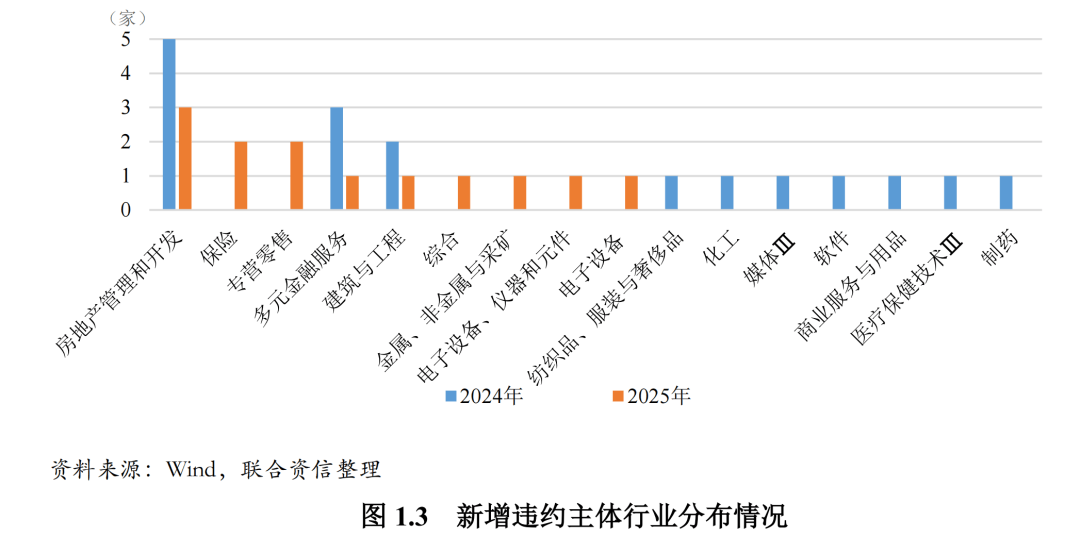 从房地产行业来看,2025年,国内房地产市场延续深度调整,整体处于筑底阶段,销售、投资及新开工等指标继续下滑,商品住宅广义库存虽在政策推动下有所去化,但仍处高位,尤其三四线城市去化压力突出。中央以“系统性去库存”和“构建发展新模式”为核心导向,通过全面取消限购限贷、降低购房成本、扩大保障房“收储”、推进“三大工程”及设立纾困基金等多维度政策托底,但政策效果结构性分化明显,核心城市阶段性企稳,非核心区域持续承压。行业融资环境边际改善但信用分层加剧,投资者风险偏好下降。在此背景下,房地产行业信用风险持续释放,本年度新增3家违约房企,分别是广州富力地产股份有限公司、奥园集团有限公司和正荣地产控股股份有限公司,三家均早在2022年出现境外违约或境内展期等信用风险暴露,整体来看对市场冲击有限。此外,2025年新增2家展期房企分别为万科企业股份有限公司(以下简称万科)和正兴隆房地产(深圳)有限公司,其中万科作为行业龙头企业,其展期备受市场关注。在行业深度调整下,万科销售回款疲软、经营性现金流恶化,叠加偿债高峰集中与再融资渠道收窄,大股东深圳地铁持续输血后支持能力接近上限,短期流动性缺口难以通过自身经营或外部融资弥补,而宏观层面房地产政策托底效果不及预期、市场信心脆弱进一步加剧资金压力,最终迫使万科启动展期以争取现金流缓冲。2025年11月26日万科首次就20亿元中票发起展期流程,12月10日、12月22日两轮核心展期方案因无首付、增信不足遭债权人否决,仅宽限期延长至30个交易日(2026年1月28日)获通过,随后万科在2026年1月推出第三版方案,增加40%本金首付、10万元固定兑付与项目应收账款质押等增信条款,与债权人持续拉锯博弈,1月20日,万科发布公告称,“21万科02”2026年第一次债券持有人会议决议议案四“关于调整‘21万科02’回售部分债券本息兑付安排、增加固定兑付安排、提供增信措施的议案”通过。另有两家建筑与工程行业企业展期,分别为欣捷投资控股集团有限公司和腾越建筑科技集团有限公司,其中腾越建筑科技集团有限公司为碧桂园地产集团有限公司的全资附属公司,其财务状况与碧桂园集团深度绑定。2025年,碧桂园启动境内外债务重组,腾越建筑作为境内9笔债券发行人之一,同步纳入整体纾困框架。